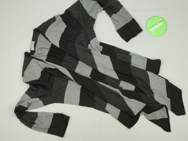 Kardigan damski w czarno-szare paski, charakteryzujący się luźnym, asymetrycznym krojem z dłuższymi przodami, które swobodnie układają się po bokach. Długie rękawy zapewniają pełne pokrycie. Idealn...
