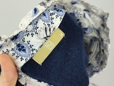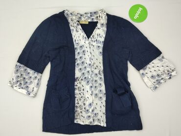 W serekKardigan w kolorze granatowym z białymi rękawami i kołnierzem w drobny wzór. Ma dekolt w kształcie litery V, dwukolorowy wzór i krótkie rękawy. Z przodu posiada dwie funkcjonalne kieszenie. Jest to idealny element garderoby na co dzień, pasujący do różnych stylizacji.