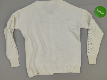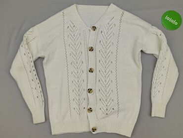 Biała dzianinowa bluzka/kardigan na guziki - Klasyczny, prosty krój z krótkim rękawem - Zapięcie na przodzie na rząd małych białych guzików - Okrągły dekolt z dekoracyjną koronkową lamówką; taki s...