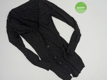 Czarny damski kardigan zapinany na guziki - Fason: dopasowany, z dekoltem w serek - Zapięcie: rząd małych guzików z przodu; guziki dekoracyjne również przy mankietach - Talia i dół: szeroki, prążk...