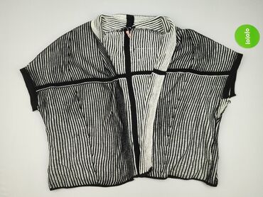 Dzianinowy kardigan w paski S/M - Kolor: czarno‑białe, drobne poziome paski - Krój: dopasowany, z szerokim, zaokrąglonym dekoltem - Rękaw: 3/4 z czarnymi, prążkowanymi ściągaczami - Zapięcie: na c...