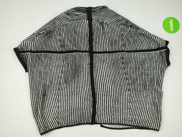 Kardigan damski w czarno-szare paski, charakteryzujący się luźnym, asymetrycznym krojem z dłuższymi przodami, które swobodnie układają się po bokach. Długie rękawy zapewniają pełne pokrycie. Idealn...Stan: