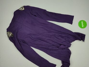 Fioletowy kardigan damski o klasycznym kroju. Posiada dekolt w kształcie litery V i jest zapinany z przodu na białe guziki, które tworzą estetyczny kontrast. Długie rękawy i prosta linia dołu zapew...