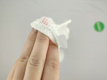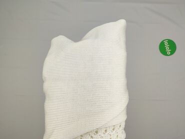 Biały kardigan damski z długim rękawem, zapinany na guziki. Klasyczny, okrągły dekolt. Dzianina o drobnym, ażurowym wzorze w drobne kropki/przeplecenia na całej powierzchni przodu i rękawów. Prosty...Stan: