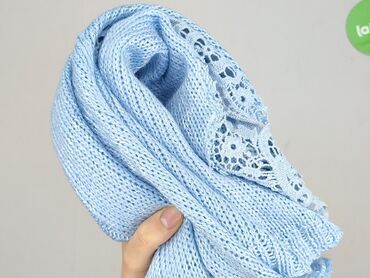Sweterek/kardigan damski, rozpinany bez guzików, w kolorze jasnego błękitu. - Fason: lekki kardigan z dekoltem w serek - Wykończenie: ozdobna lamówka z koronki przy krawędzi przodu i dekoltu (białe...
