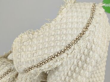 Ażurowy bolerko/kardigan damski na krótki rękaw - Kolor: ecru/śmietankowy - Krój: krótkie, otwarte bolerko do narzutki - Materiał: szydełkowa, ażurowa siateczka z delikatną, błyszczącą nitką - Ozd...Stan:
