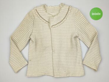Kardigan damski, dzianinowy, w kolorze kremowej bieli. - Fason: rozpinany, głęboki dekolt V, zapinany na 3 duże, cieniowane guziki. - Rękawy: długie, zdobione wypukłymi supełkami/„bąbelkami” (stru...