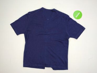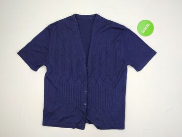 Ażurowy sweterek/kardigan damski zapinany na guziki. - Kolor: granatowy - Krój: prosta linia, dekolt w serek, krótkie rękawy - Zapięcie: rząd małych, brązowych guzików z przodu - Materiał: cienka,...