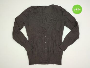 Kardigan damski zapinany na guziki - Kolor: karmelowy/brązowy - Fason: lekko dopasowany, pionowe prążkowanie - Dekolt: głęboki V - Rękawy: 3/4, lekko rozszerzane - Zapięcie: pięć dużych, okrągłych...Stan: