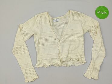 Kardigan damski Cropp - Kolor: pastelowy żółty - Rozmiar z metki: L - Krój: krótki, crop, zapinany na 3 duże guziki z przodu - Dekolt: w serek - Rękawy: długie, swobodne - Wykończenie: szerokie, p...