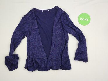 Damska narzutka/kardigan w kolorze granatowym z ozdobnymi, srebrnymi nitami/koralikami przy dekolcie, mankietach, kieszeniach i u dołu. Luźny, otwarty fason bez zapięcia, długość do bioder/za biodr...Stan: