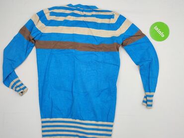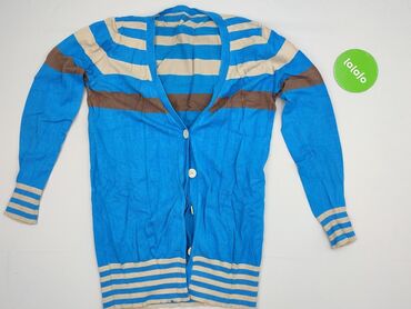 Damski kardigan bez zapięcia, rozmiar S. - Kolor i wzór: melanżowe, poziome paski w odcieniach granatu i bieli - Krój: swobodny, lekko wydłużony, z kołnierzem/szeroką plisą z przodu; długie rękawy...