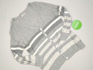 Damski kardigan w paski, zapinany na guziki. - Krój: klasyczny, prosty; dekolt w serek - Rękawy: 3/4 - Wzór: poziome paski w odcieniach szarości z delikatną, połyskującą nitką - Materiał: 93% akry...