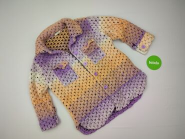 - Detale: fioletowe guziki z przodu i przy mankietach; gruby, miękki splot o wyrazistej fakturze