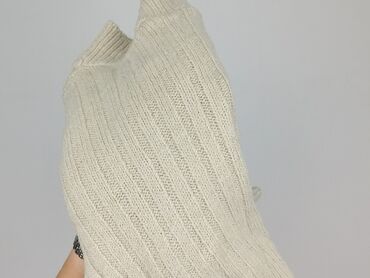 - Wzór i wykończenie: gruby, prążkowany splot; dekoracyjne warkocze oraz ozdobne przeploty po bokach z przodu; szeroki, miękki kołnierz/szala