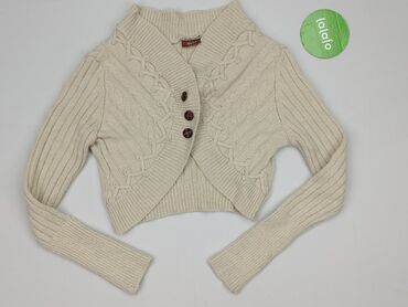 Ażurowy kardigan/bolerko damskie - Kolor: ecru/kremowy - Krój: dopasowany, lekko taliowany - Zapięcie: jedno wiązanie/sznureczek na środku - Rękawy: krótkie - Dekolt: głęboki w kształcie litery V ...