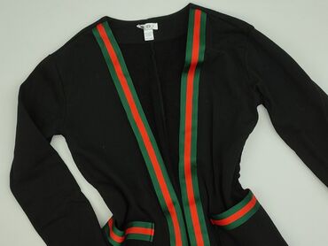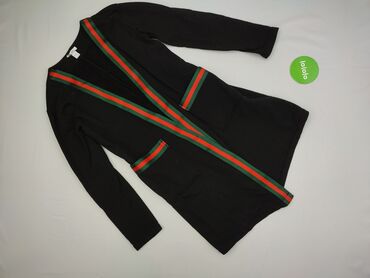 Dzianinowy kardigan w paski S/M - Kolor: czarno‑białe, drobne poziome paski - Krój: dopasowany, z szerokim, zaokrąglonym dekoltem - Rękaw: 3/4 z czarnymi, prążkowanymi ściągaczami - Zapięcie: na c...