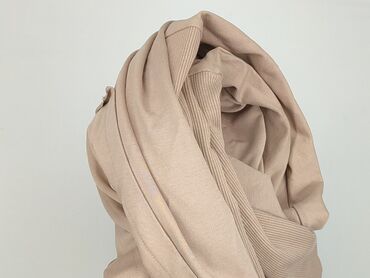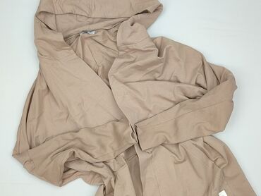 Długi kardigan damski z kapturem, beżowy. - Fason: otwarty, bez zapięcia, pasek do przewiązania w talii - Długość: za biodra (prawie do kolan) - Rękawy: 3/4 z szerokimi, prążkowanymi mankietami - ...