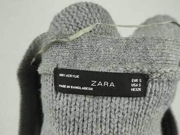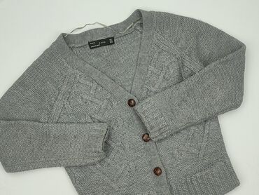 Szary kardigan damski na guziki - Krój: krótki, lekko pudełkowy, z długim rękawem - Zapięcie: 4 guziki z przodu - Dekolt: okrągły - Wykończenia: ściągacze przy mankietach i u dołu - Splot: wyraźny...Stan: