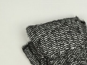 - Wzór: czarno‑biały, mieszanka jodełki i drobnych pasków; dekoracyjne strzępienia przy krawędziach