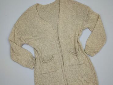 Długi kardigan damski bez zapięcia, w kolorze jasnego beżu ze złotą, delikatnie połyskującą nitką. - Krój: swobodny, prosty, długość za biodra. - Rękawy: długie, zakończone ściągaczem. - Dekolt:...Stan: