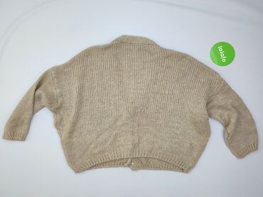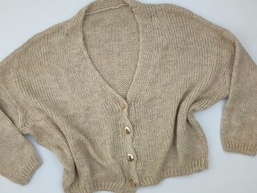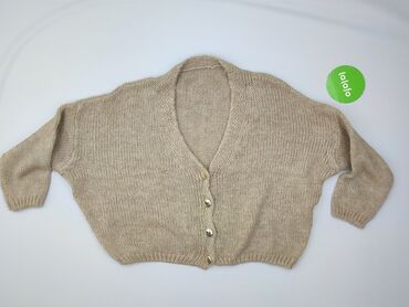 Krótki kardigan damski, biały/ecru, zapinany na guziki. - Fason: krótki, luźny, z obniżoną linią ramion; dekolt w serek; ściągacz na dole i przy mankietach. - Zapięcie: dwa dekoracyjne guziki z po...Stan: