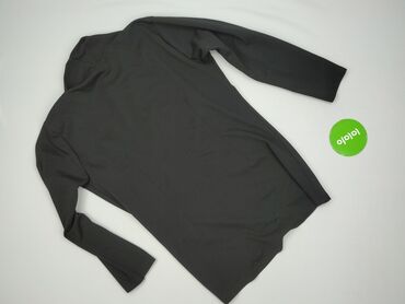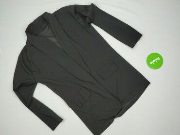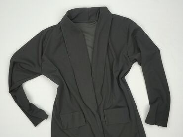 Czarny damski żakiet bez zapięcia - Krój: krótki, dopasowany, z modelującymi cięciami. - Dekolt: okrągły. - Rękawy: 3/4. - Przód: otwarty, bez guzików/zamek ukryty listwą (dekoracyjna listwa na śr...