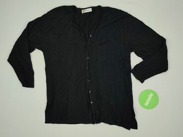 Damski kardigan zapinany na guziki - Kolor: czarny - Fason: dopasowany, z głębokim dekoltem V - Zapięcie: trzy małe guziki z przodu - Rękaw: długi - Detale: szeroki, prążkowany pas w talii optyczn...Stan: