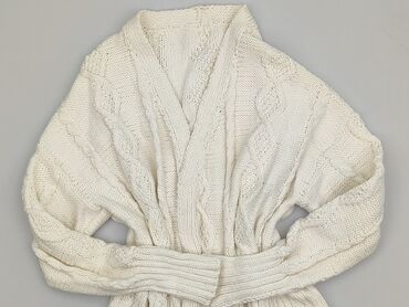 Biały dzianinowy kardigan damski z paskiem w talii. - Krój: otwarty, wiązany w pasie sznurkiem z tej samej dzianiny - Długość: do bioder/połowy uda - Rękawy: długie, wykończone ściągaczem - Wzór d...