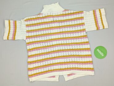 - Wzór i kolor: poziome pasy w odcieniach bieli, różu i musztardowej żółci; ażurowa, przewiewna dzianina.