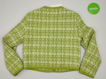 Kardigan damski z długimi rękawami, charakteryzujący się wzorem w paski w odcieniach zieleni, żółci i błękitu. Dekolt w kształcie litery V i zapięcie na guziki dodają mu klasycznego wyglądu. Jest t...
