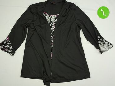 Czarny kardigan damski Women’s Collection - Rozmiar: XL (z metki) - Krój: swobodny, zapinany na jeden guzik - Dekolt: w serek z szeroką, prążkowaną plisą - Rękawy: 3/4 - Kieszenie: dwie naszywane ...