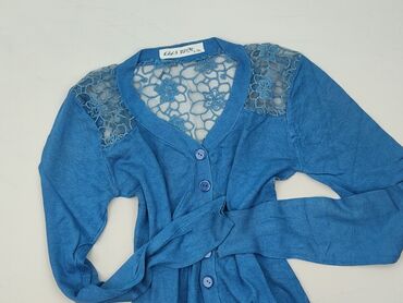 Kardigan damski, dzianinowy, w kolorze ecru/kremowym. Model bez zapięcia, z wyraźnym, pionowym ażurowym wzorem z przodu, wykończony ściągaczami przy mankietach i na dole. Długość do bioder, klasycz...