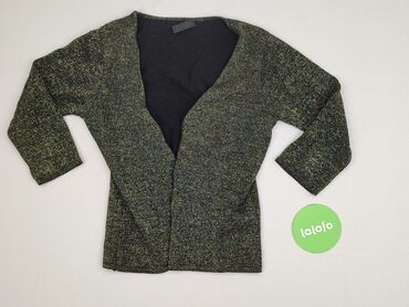 Czarny kardigan damski, rozmiar S. - Krój: luźniejszy, bez zapięcia, z dekoltem w serek (V-neck). - Długość do bioder, długie rękawy. - Ażurowe, delikatne przeszycia wzdłuż przodu i na rękawach....