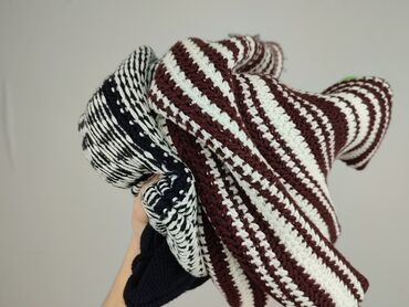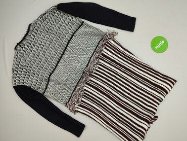 - Wzór i kolory: miks dzianin i wzorów w odcieniach czerni/granatu i bieli na górze; dół w pasy bordo–krem; kontrastowe łączenie z dekoracyjnymi frędzlami w talii
