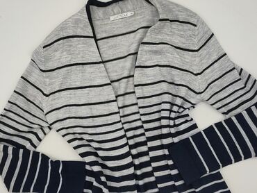 Damski kardigan w paski - Krój: zapinany na guziki z przodu, dekolt w kształcie litery V - Rękaw: długi - Wzór: poziome paski w odcieniach szarości, bieli i jasnego błękitu - Materiał: miękka, ela...