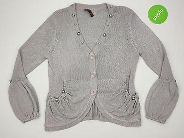 Szary kardigan damski TATUUM, rozmiar M. - Krój: krótki, luźniejszy, z obniżoną linią ramion i krótkim rękawem - Zapięcie: na duże guziki z przodu - Wzór/struktura: delikatna, geometryczna faktura...