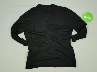 Czarny kardigan damski bez zapięcia, rozm. L/XL. - Fason: lekko wydłużony, z długim rękawem, otwarty przód. - Dekolt: okrągły, ozdobny pasek z drobną lamówką i trzema dekoracyjnymi elementami przy...