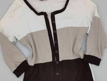 - Kolorystyka: blokowe pasy w trzech odcieniach – biały (góra i część pleców), beżowy (środek, rękawy), ciemnobrązowy (dół, listwa guzikowa, mankiety i ściągacz u dołu)