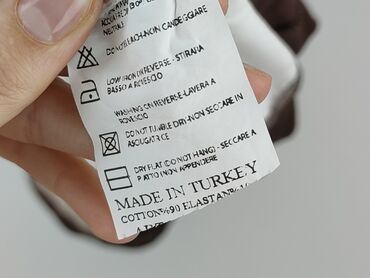 - Wskazówki pielęgnacyjne z metki: pranie na lewej stronie, nie wybielać, niskie prasowanie, nie suszyć w suszarce, suszyć na płasko