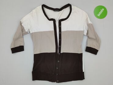 Damski kardigan bez zapięcia, rozmiar S. - Kolor i wzór: melanżowe, poziome paski w odcieniach granatu i bieli - Krój: swobodny, lekko wydłużony, z kołnierzem/szeroką plisą z przodu; długie rękawy...