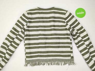 OkrągłyKardigan damski marki Vero Moda w paski, w rozmiarze M. Charakteryzuje się połączeniem koloru zielonego i białego, tworząc poziome pasy na całej powierzchni. Przód kardiganu oraz dolna krawędź ozdobione są frędzlami, dodającymi unikalnego charakteru. Model z długim rękawem, bez zapięcia, co sprawia, że jest idealny do noszenia na co dzień jako warstwa wierzchnia. Wykonany z dzianinowego materiału, zapewnia komfort noszenia.