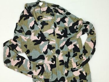 Kardigan damski w militarny wzór camo - Marka: Osh (etykieta na zdjęciu) - Rozmiar z metki: S - Krój: krótki kardigan zapinany na 4 guziki - Dekolt: głęboki V-neck - Kolorystyka: beże, oliwkowa zi...