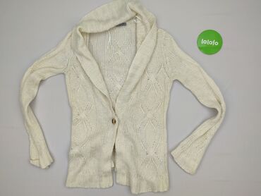 Kardigan damski w kolorze kremowym, wykonany z dzianiny. Charakteryzuje się dekoltem w kształcie litery V i zapięciem na guziki. Sweter posiada długie rękawy z ażurowymi wzorami, które nadają mu le...