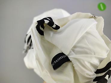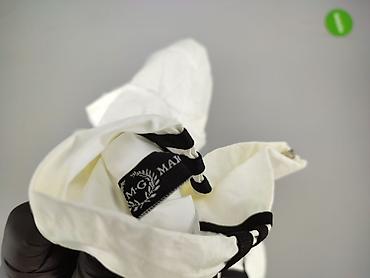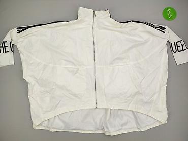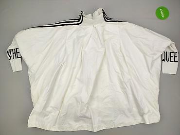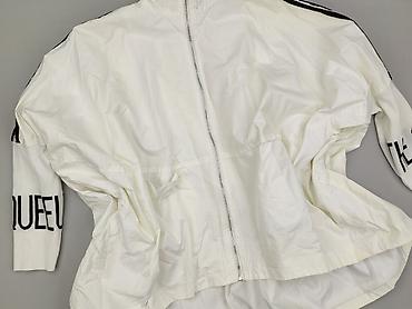 Biała damska kurtka/wiatrówka oversize z zamkiem na całej długości. Krój bardzo luźny, nietoperzowe rękawy i wydłużony tył dla swobodnego, modowego efektu. Stójka przy szyi, po bokach wszyte kieszenie. Na ramionach czarne lampasy, na szerokich prążkowanych mankietach kontrastowy czarny napis. Materiał lekki, gładki, z podszewką – idealny jako lekka narzutka chroniąca przed wiatrem. Detale wewnętrzne: metki z oznaczeniami „M.G” i „FASHION”. Kolor: śmietankowa biel z czarnymi akcentami. Styl sportowo-miejski, świetny do casualowych stylizacji. Dla kobiet. Używana.