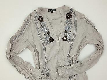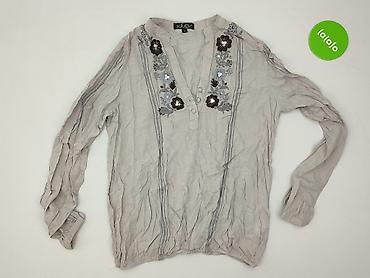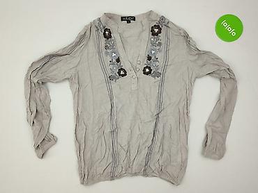 Szara bluzka damska MOKO, rozmiar 40. - Fason: prosta, z długim rękawem - Dekolt: okrągły, z tyłu wiązanie na czarną tasiemkę - Wzór: melanż szarości z nadrukiem/ aplikacją skrzydła motyla w odcien...