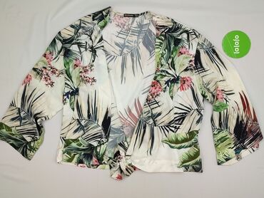 Kimono damskie New Look, rozmiar 12 (UK). - Luźny, otwarty krój bez zapięcia - Szerokie rękawy typu kimono - Lekka, przewiewna tkanina - Wzór: tropikalne liście i kwiaty w odcieniach zieleni, fiol...