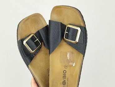 Klapki damskie z ozdobnymi koralikami - Model: wsuwane klapki na płaskiej podeszwie - Rozmiar: 40 (oznaczenie na wkładce i podeszwie) - Kolor: czarny pasek, jasnobeżowa wkładka - Cholewka: szeroki...
