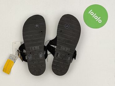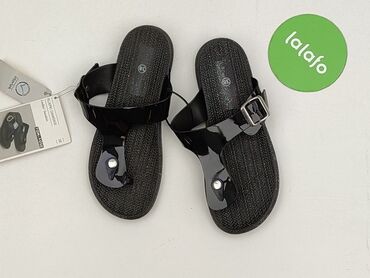 Klapki damskie z ozdobnymi koralikami - Model: wsuwane klapki na płaskiej podeszwie - Rozmiar: 40 (oznaczenie na wkładce i podeszwie) - Kolor: czarny pasek, jasnobeżowa wkładka - Cholewka: szeroki...