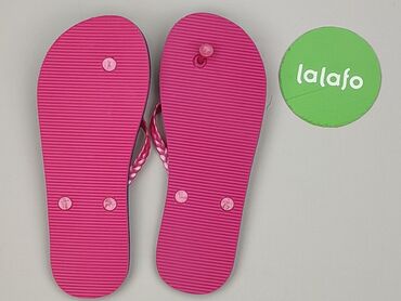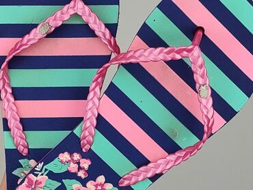 Japonki “SUMMER LOVE” – rozmiar 39 - Kolorystyka: granatowa podeszwa z tropikalnym, kwiatowym nadrukiem; różowe, błyszczące paski. - Nadruk: napis SUMMER LOVE z serduszkiem. - Podeszwa: czarna, el...